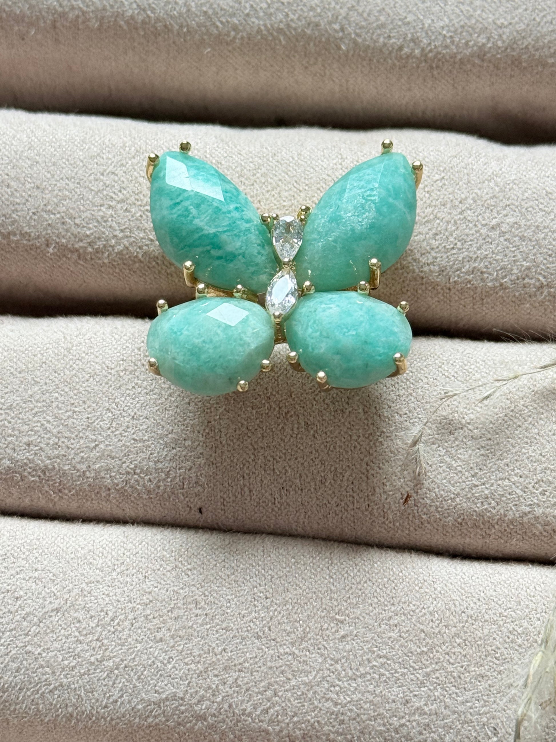 Laissez-vous séduire par la bague Papillon Éclat, une pièce délicate et lumineuse inspirée de la légèreté des papillons. Composée de pierres facettées aux couleurs vibrantes et montées sur une base dorée, elle apporte une touche de fraîcheur et de féminité à toutes vos tenues.