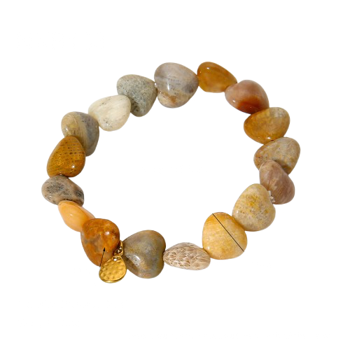 Ce bracelet est composé de pierres d’agate miel de jaspe beige aux formes organiques et authentiques, mettant en valeur toute la beauté brute de la nature. Les nuances douces et chaudes s’accordent facilement avec toutes les tenues, tandis que les détails dorés ajoutent une note raffinée. Confortable et ajustable, il est idéal à porter seul ou en accumulation.