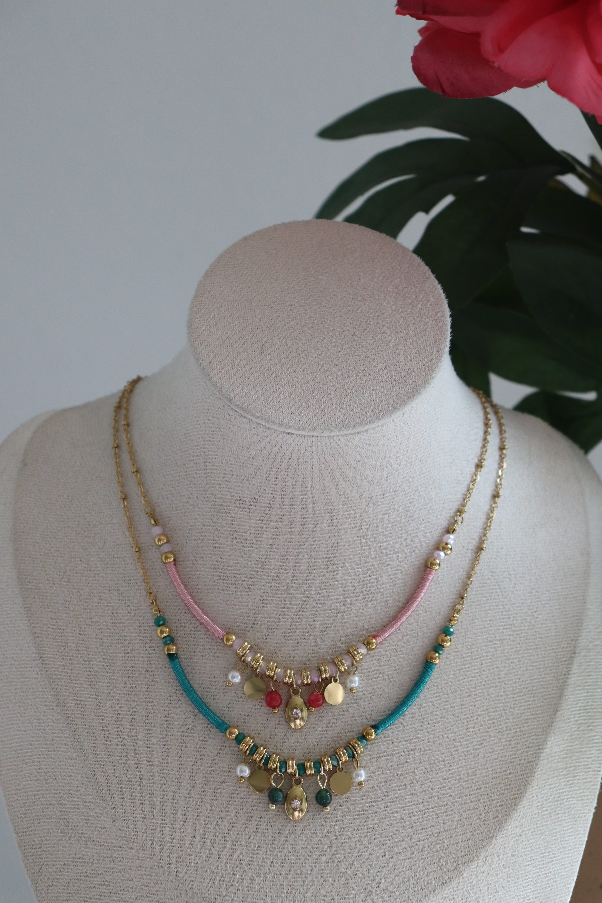Le collier Mayma Pink est en acier inoxydable, composée de multi Breloques en pierre naturelle ne change pas de couleur.
