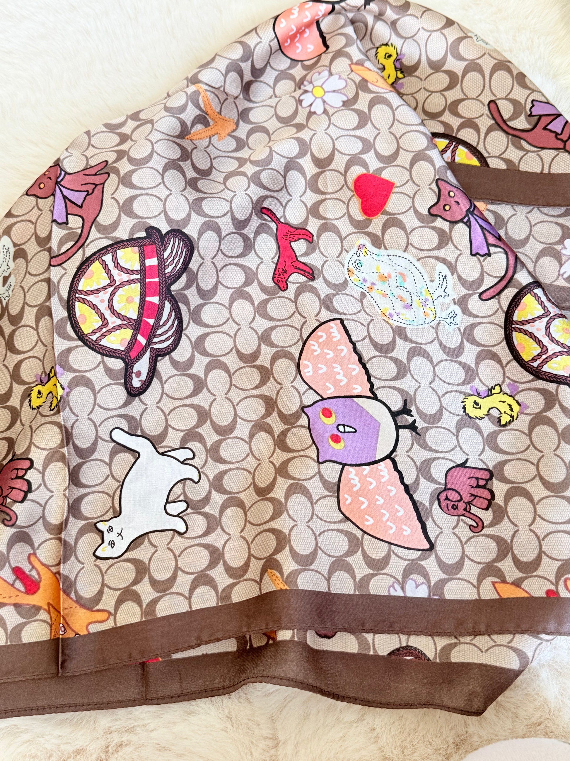 Foulard carré avec imprimé coloré . Polyvalent et élégant, il peut être porté autour du cou, dans les cheveux ou sur le sac, ajoutant une touche joyeuse et sophistiquée à n'importe quel look.