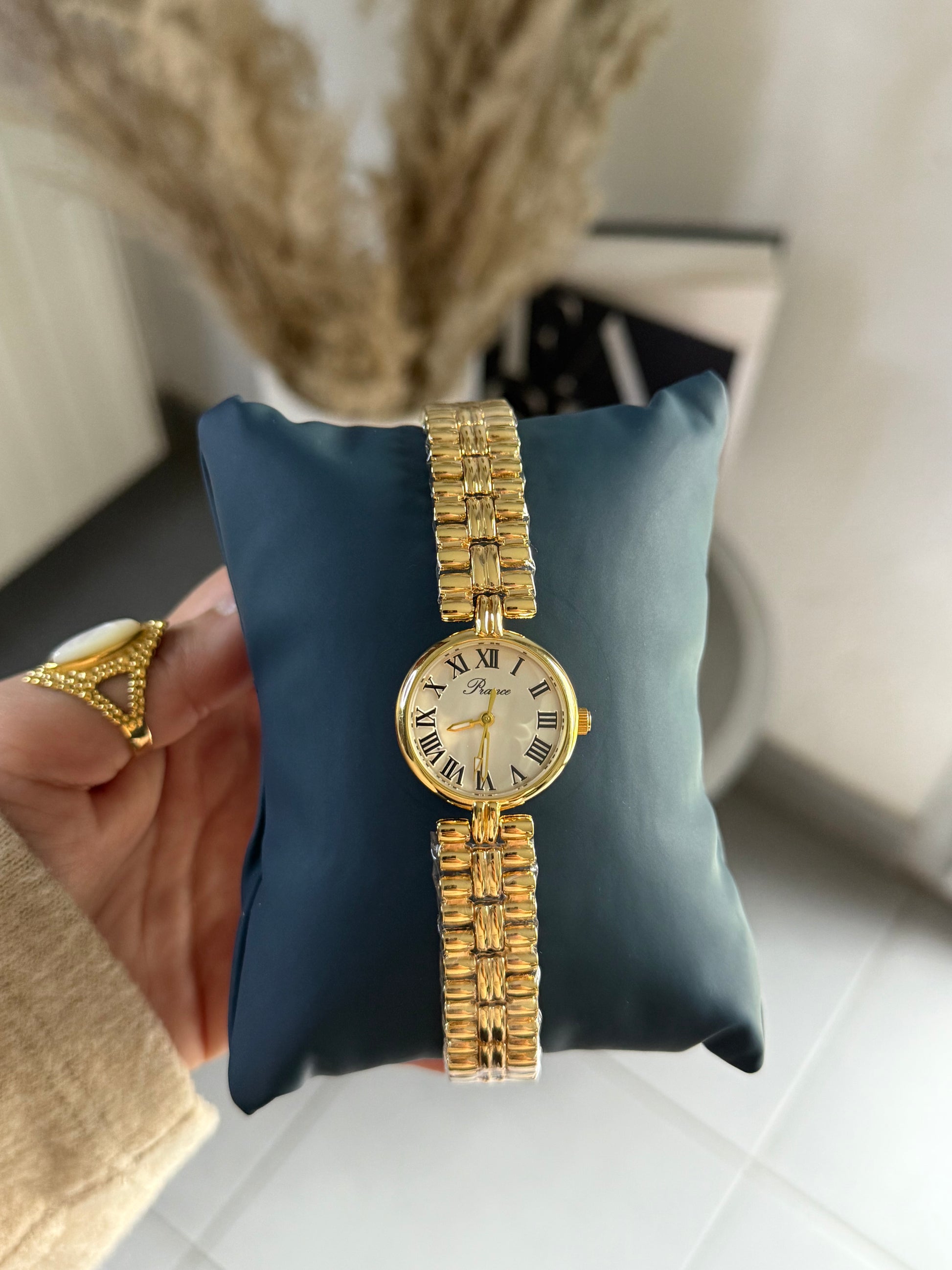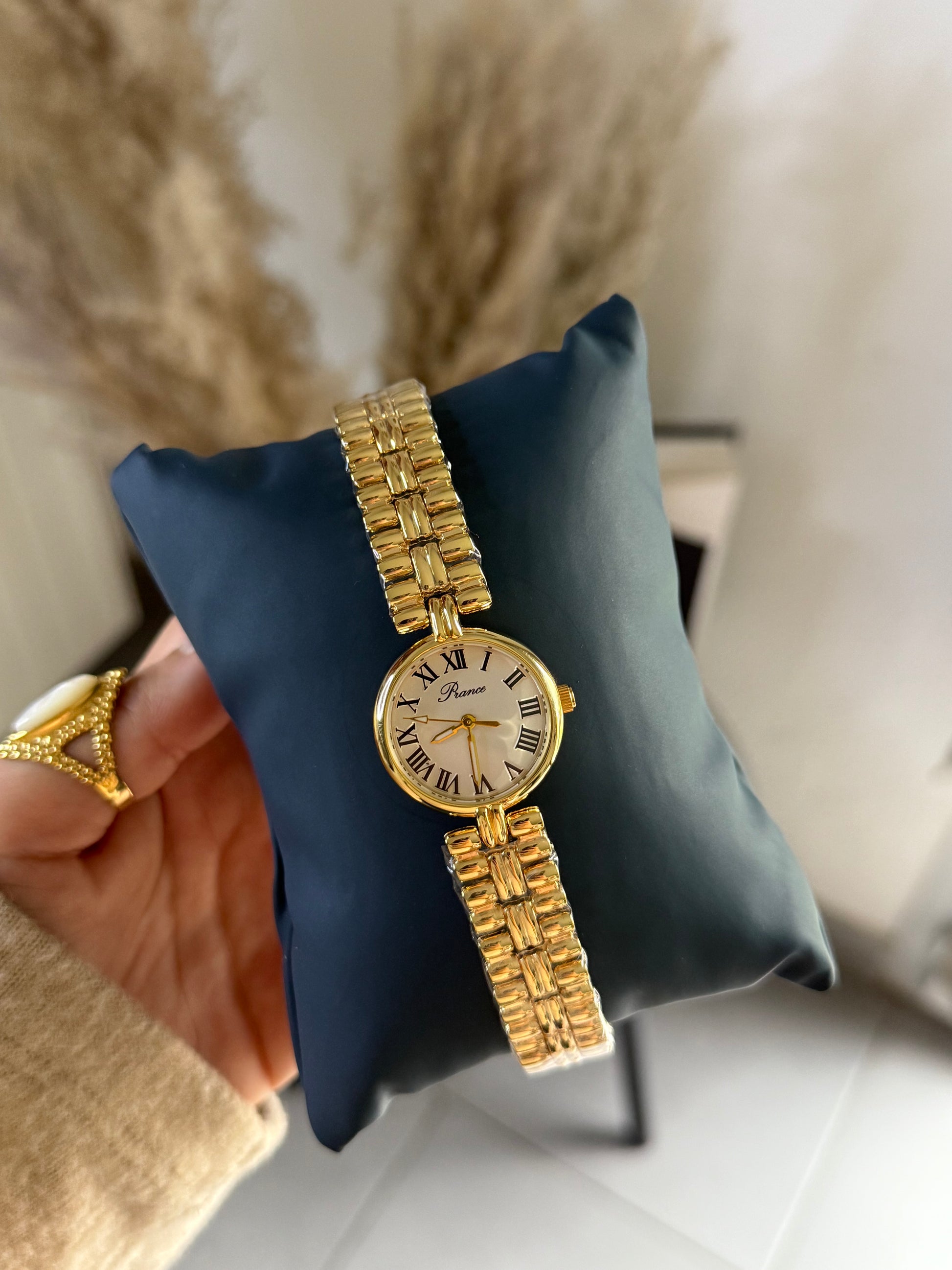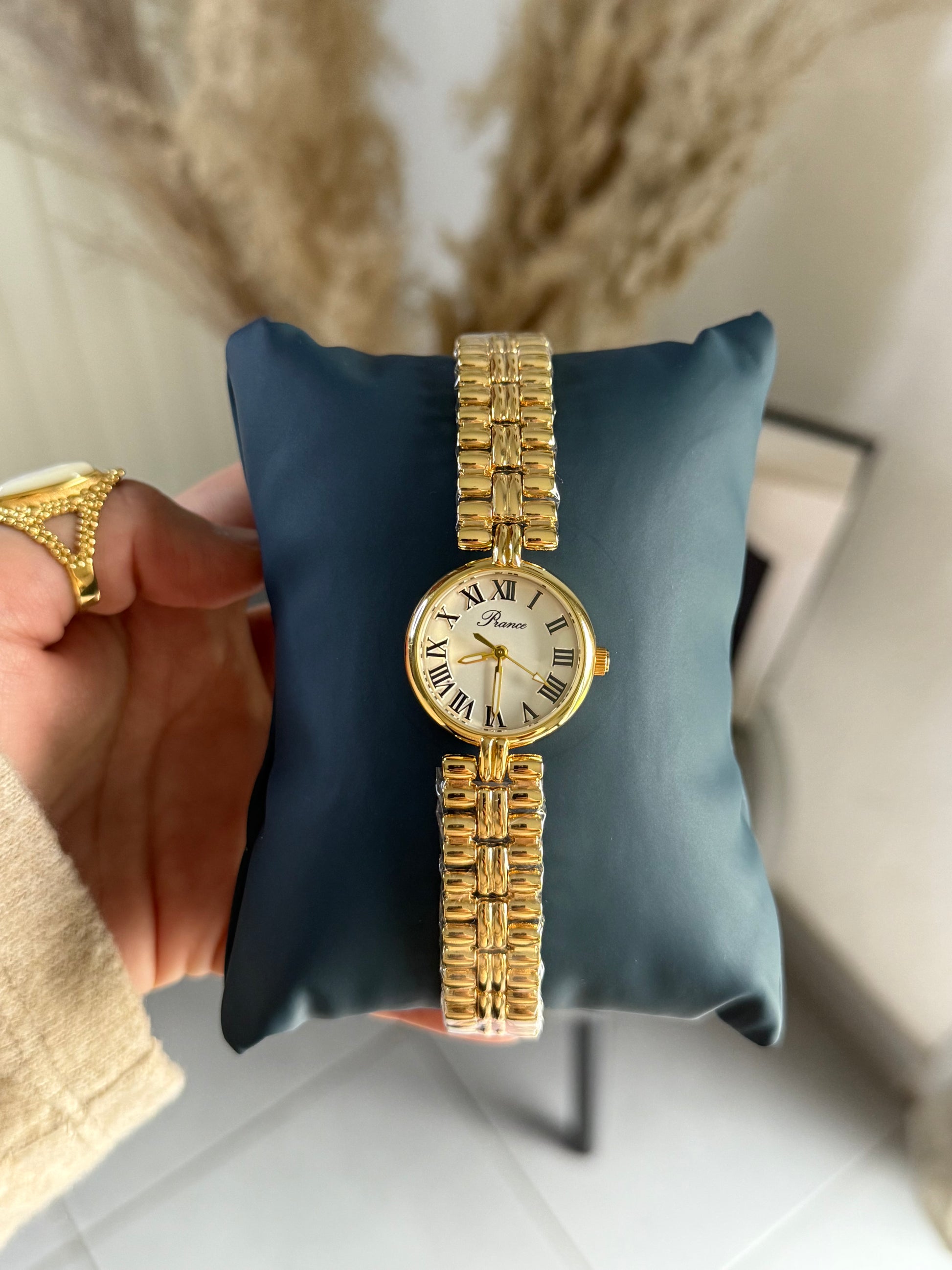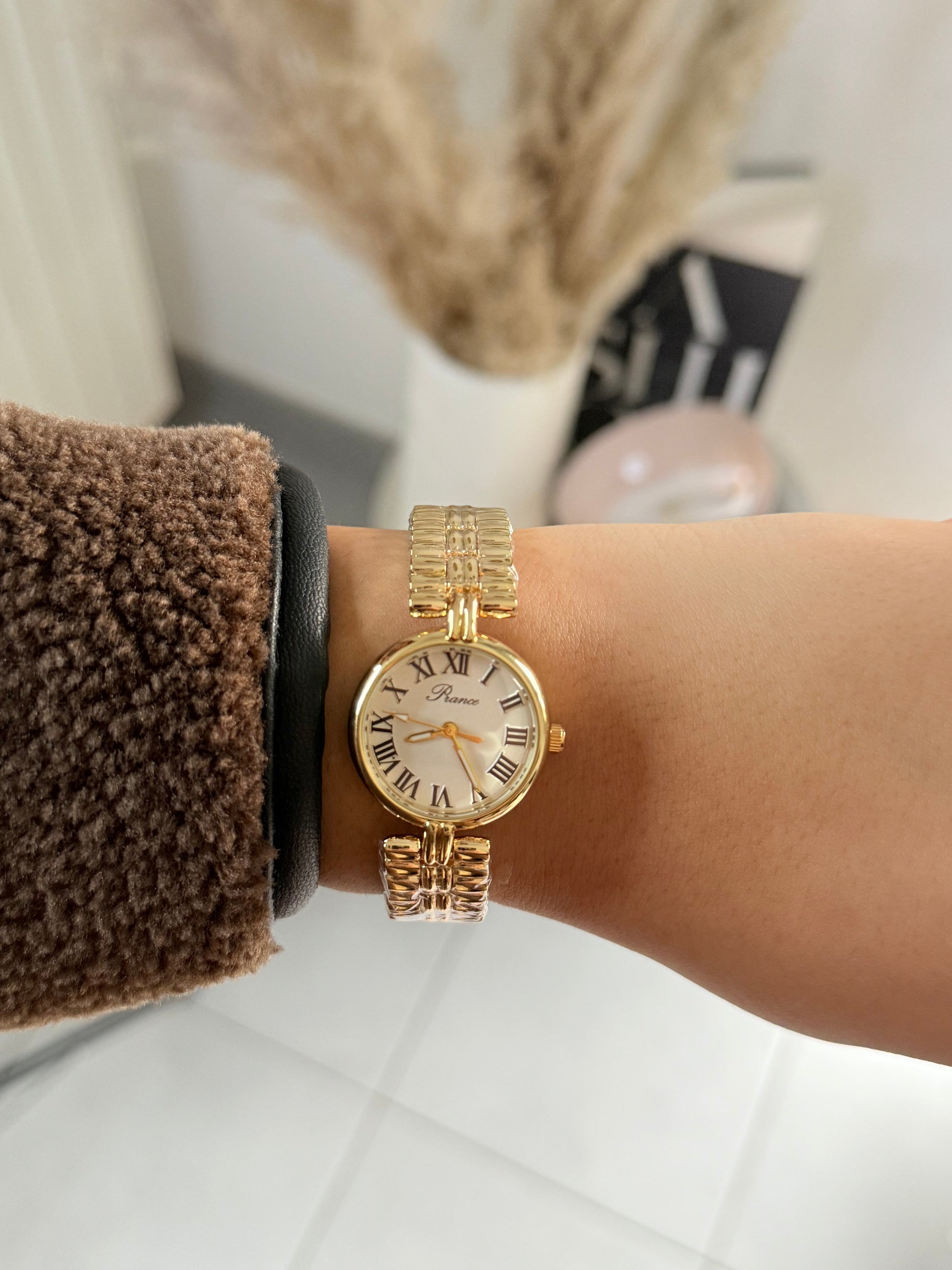 Cadran blanc classique à chiffres romains, bracelet doré articulé à reflets satinés — un bijou d’élégance vintage.