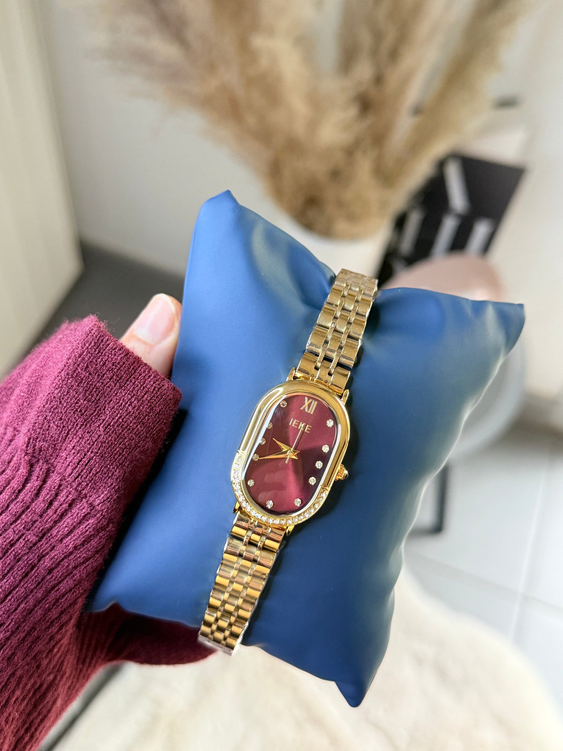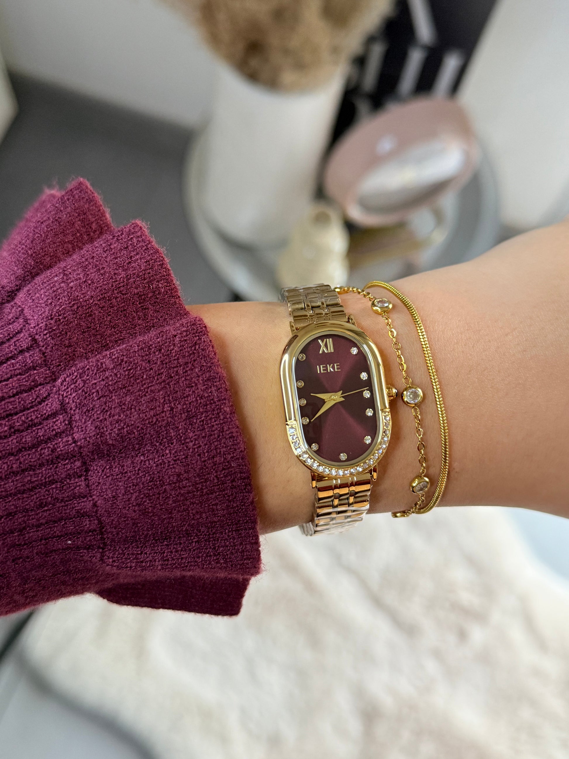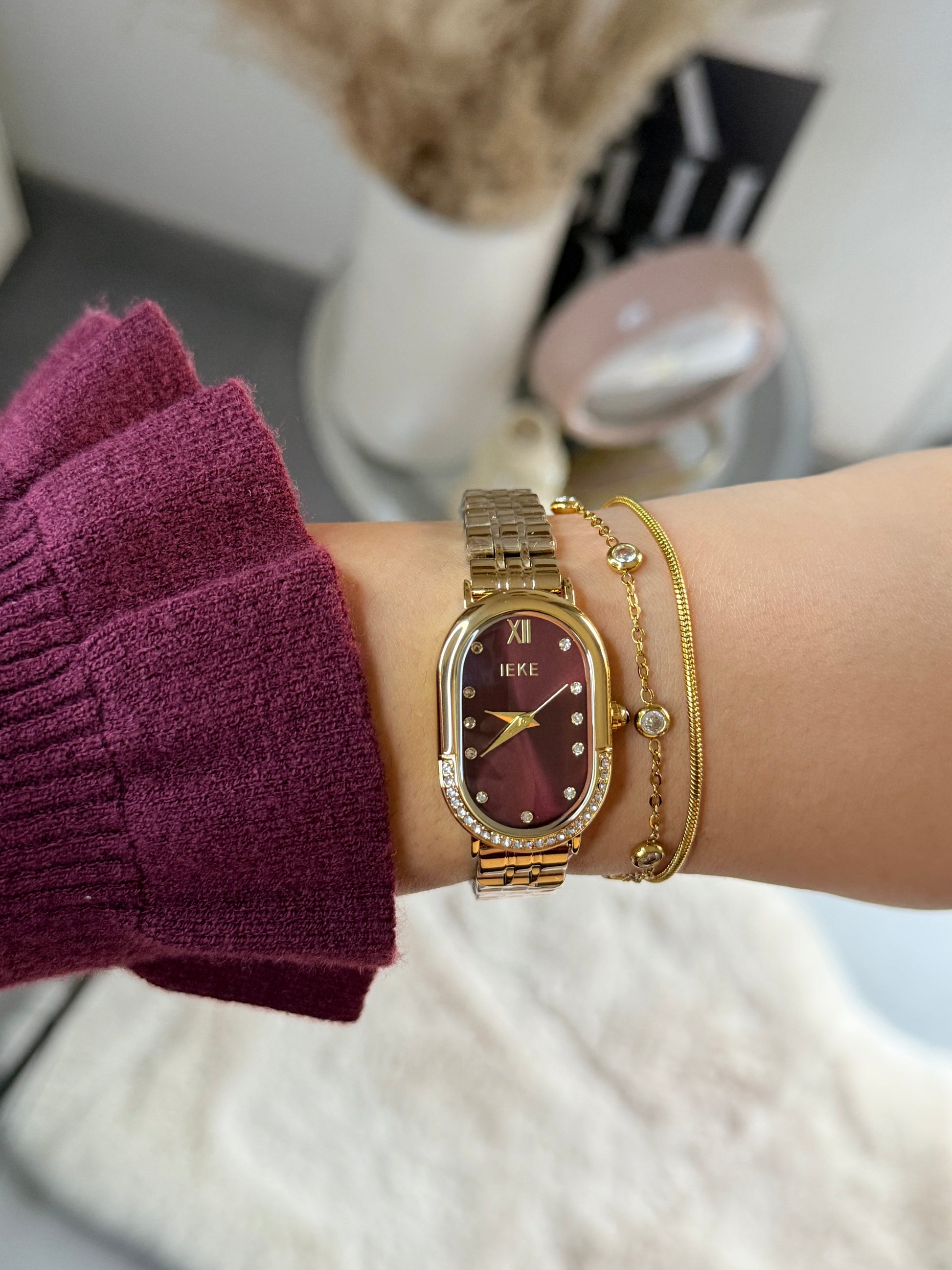 Montre rectangulaire ovale à cadran bordeaux profond, sublimée par un bracelet doré à maillons fins. Son design raffiné évoque une élégance intemporelle.