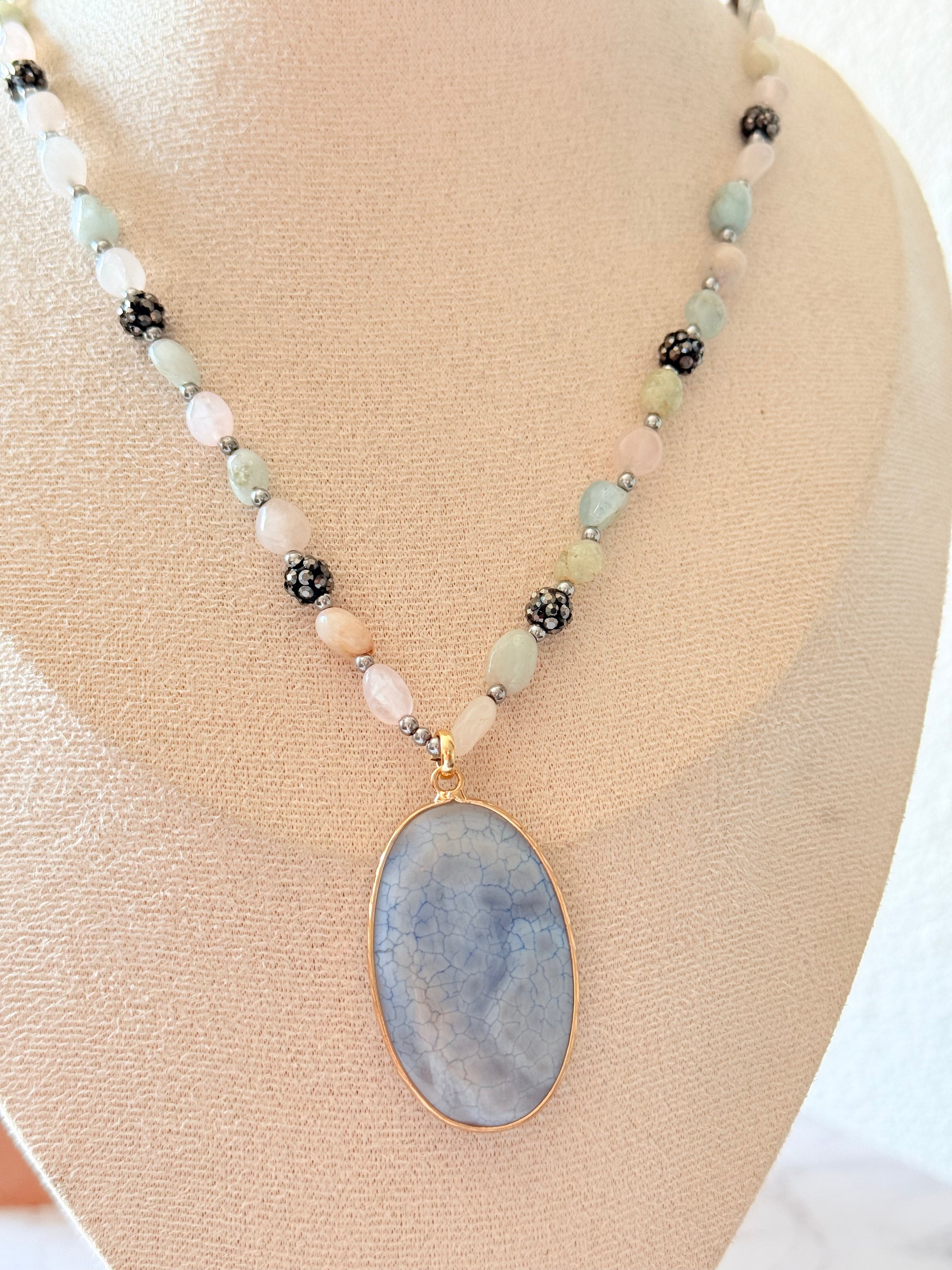 Ce sautoir unique allie l’élégance des pierres naturelles multicolores à la singularité d’un pendentif ovale aux reflets violets marbrés. Les perles aux formes organiques se mêlent à des éléments métalliques finement travaillés, créant un équilibre parfait entre sophistication et esprit bohème. Idéal pour apporter une touche d’originalité et de douceur à votre tenue, ce bijou se porte aussi bien au quotidien qu’en soirée.